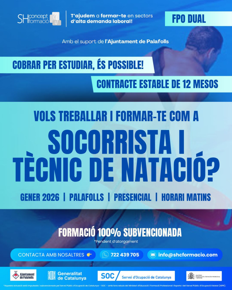 L’Ajuntament de Palafolls, en col·laboració amb el centre SH Concept Formació, impulsa una nova edició del Programa de Formació Professional per a l’Ocupació (FPO) DUAL en les especialitats de Socorrisme aquàtic i Tècnic/a en activitats de natació. Aquest projecte, 100 % subvencionat pel Servei d’Ocupació de Catalunya (SOC) amb fons del Servicio Público de Empleo Estatal (SEPE), arrencarà a finals de novembre, amb la selecció dels candidats, i permetrà als i les alumnes esdevenir professionals en instal·lacions aquàtiques. Objectius i requisits El programa té dos eixos principals: d’una banda, millorar l’ocupabilitat de les persones joves i majors de 29 anys amb dificultats per accedir al mercat de treball en situació d’atur, amb baix nivell formatiu o sense qualificació; de l’altra, dotar les empreses del sector aquàtic de professionals formats i qualificats, atenent la dificultat de trobar personal especialitzat. Les places són limitades (15 en total) i els requisits inclouen el graduat d’ESO o equivalent, estar inscrits al Servei d’ocupació de Catalunya (SOC) com a demandant d’ocupació no ocupat (DONO). Així com complir tots els requisits legals per poder formalitzar un contracte de formació en alternança. També caldrà superar una prova de natació (200 m en 4 minuts) i una entrevista personal. Contingut del programa i titulacions El programa preveu una formació de 1120 hores que permetrà obtenir dos Certificats de Professionalitat: La part teòrica de la formació s’impartirà al centre Can Batlle i la pràctica a la piscina del CEM Tordera. El contracte serà de formació en alternança amb una durada prevista de 12 mesos (1.170 hores de treball), combinant formació (35%) i experiència laboral efectiva (65%). Inscripció El procés de selecció es troba obert durant aquests darrers dies d’octubre i el mes de novembre, fins a cobrir les 15 places disponibles. Cal emplenant el formulari de preinscripció complint tots els requisits i superar la prova de natació i l’entrevista. La formació començarà a principis del mes de gener del proper any i permetrà treballar com a socorrista a piscines, parcs aquàtics fer de professor de natació, animador aquàtic o d'àrbitre en competicions oficials entre d’altres.