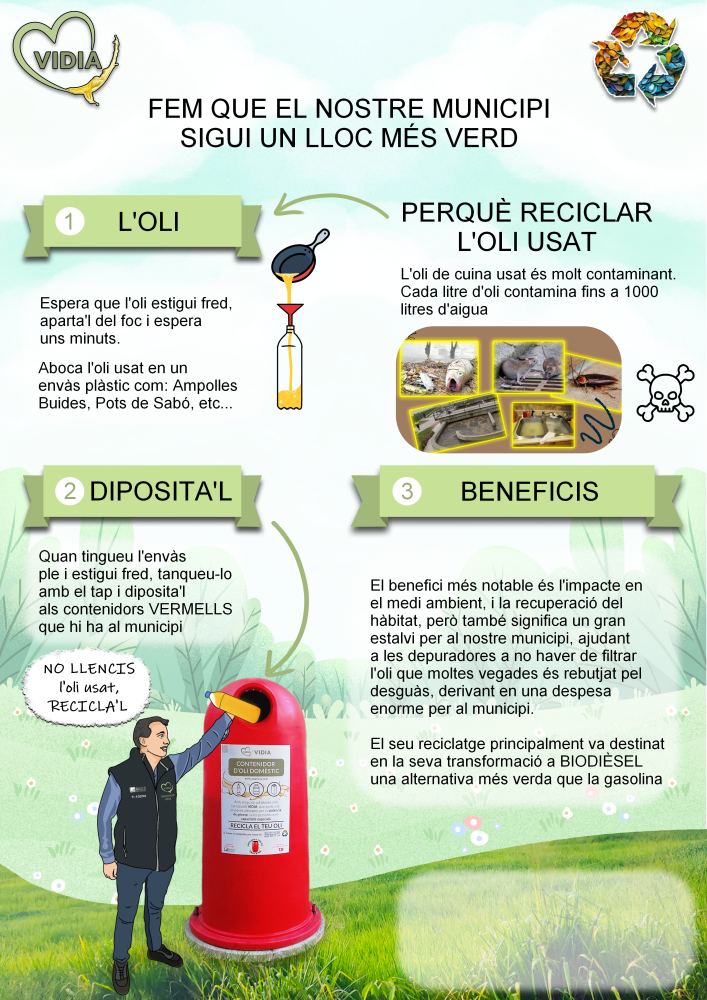 L’Ajuntament de Palafolls ha tancat el primer any sencer del servei de recollida d’oli vegetal domèstic usat als contenidors vermells distribuïts pel municipi. Durant l’any 2025 s’han recollit 1.745,32 kg d’oli, segons el certificat oficial aportat per l’Associació VIDIA, entitat responsable de la gestió del servei. Aquest projecte, implantat a mitjans de 2024, ha permès donar una sortida sostenible a un residu altament contaminant: un litre d’oli pot arribar a contaminar fins a 1.000 litres d’aigua i provocar greus afectacions a la xarxa de clavegueram si es llença per l’aigüera. La recollida d’oli és possible gràcies a un conveni de col·laboració entre l’Ajuntament i l’Associació VIDIA, entitat sense ànim de lucre que no només gestiona la recollida i el reciclatge, sinó que desenvolupa un projecte social de gran rellevància: L’oli recollit a Palafolls es destina exclusivament a la fabricació de biocombustibles industrials, una alternativa energètica més neta i sostenible. Com funciona el servei? El municipi disposa actualment de contenidors vermells repartits tant al nucli urbà com a les urbanitzacions. Per participar en el servei, cal: El sistema evita vessaments, facilita la recollida i garanteix el correcte tractament del residu. L’Ajuntament de Palafolls valora positivament els resultats del primer any complet i anima la ciutadania a continuar utilitzant aquest servei.